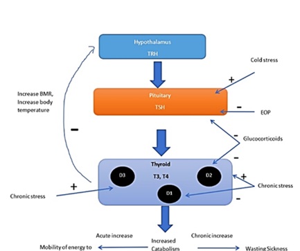 Long-term exposures to cool temperatures stimulate the thyroid axis mainly by increasing TSH levels. The resulting increase in basal metabolic rate and increased body temperature can inhibit the thyroid axis [25]. In the context of survival, reduced thyroid activity would decrease metabolism and corresponding energy usage. This is especially useful when food is scarce. However, activation of the thyroid axis becomes bene?cial during cold stress. The resultant increase in endogenous opioids and glucocorticoid levels during stress can also cause suppression of the thyroid axis [26]. Effect of stress on thyroid axis has been shown in (Figure 10).