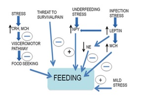 Leptin, a hormone produced by fat cells, can suppress appetite by interacting with melanocortin (MC-4) receptors located in Proopiomelanocortin (POMC) neurons within the arcuate nucleus of the medulla oblongata [27]. When faced with stress, the body's release of CRH can also reduce appetite by activating the HPA axis. Pro-inflammatory cytokines can cause anorexia and stimulate the production of leptin, which can in turn decrease food intake by affecting the hypothalamus [28]. Effect of stress on feeding is described in (Figure 11).