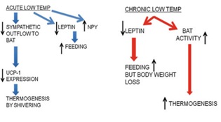 Under normal circumstances, leptin and NPY work together to regulate energy balance. However, when exposed to low temperatures, leptin levels decrease, leading to an increase in food intake [29]. Conversely, NPY levels in the hypothalamus increase, leading to an increase in appetite. The protein UCP1 plays a role in generating heat in brown adipose tissue (BAT) rather than energy, leading to thermogenesis. Animals exposed to cold for 21 days or more experience a decrease in leptin levels but no increase in NPY levels [30]. This leads to weight loss, likely due to increased thermogenesis in BAT. Animals lacking BAT tend to gain weight. These findings suggest that thermogenesis in BAT plays a crucial role in energy homeostasis, and that cold exposure can stimulate this process. Feeding response to acute and chronic cold stress is shown in (Figure 12).