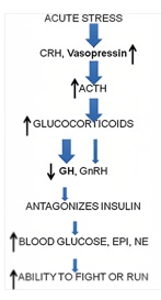 The body's Sympathetic Nervous System (SNS) is also activated during times of stress, and the Paraventricular Nucleus (PVN) helps boost SNS activity to aid in the stress response. Oxytocin and epinephrine can promote the secretion of Adrenocorticotropic Hormone (ACTH), further supporting the body's response to stress. In acute stress, ACTH increases the concentration of glucocorticoids, which lead to decrease in growth hormone and Gonadotropin Releasing Hormone (GnRH). These hormones together decrease insulin levels in body, increase blood glucose, epinephrin and nor-epinephrin and thereby increases ability of body to undergo fight and flight reaction.