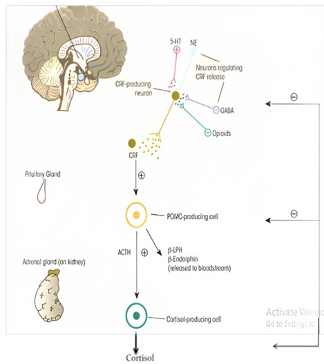 The Hypothalamic-Pituitary-Adrenal (HPA) axis mediates the main elements of the stress response. Corticotropin-Releasing Factor (CRF) is produced and released by nerve cells in the hypothalamus as a result of stress. The anterior pituitary gland receives CRF, which induces the creation of the Protein Proopiomelanocortin (POMC). Adrenocorticotropic hormone (ACTH), -Lipotropin (-LPH), and -endorphin are released by POMC in response to stress. When cortisol is released, it inhibits the release of ACTH and CRF. Physiological functions including growth and reproduction are momentarily suppressed when glucocorticoid levels are briefly raised. This helps the animal to utilize biological resources for reflex responses like flying more effectively [8]. When CRF binds to its receptor on pituitary corticotropes, it induces the release of Adrenocorticotropic Hormone (ACTH) into the systemic circulation. Circulating ACTH principally targets adrenal cortex, where glucocorticoid synthesis is stimulated and secreted from the zona fasciculata. Glucocorticoids are the downstream effectors of the HPA axis and regulate physiological changes through ubiquitously distributed intracellular receptors [9]. Endocrine pathway in ACTH is shown in (Figure 4).