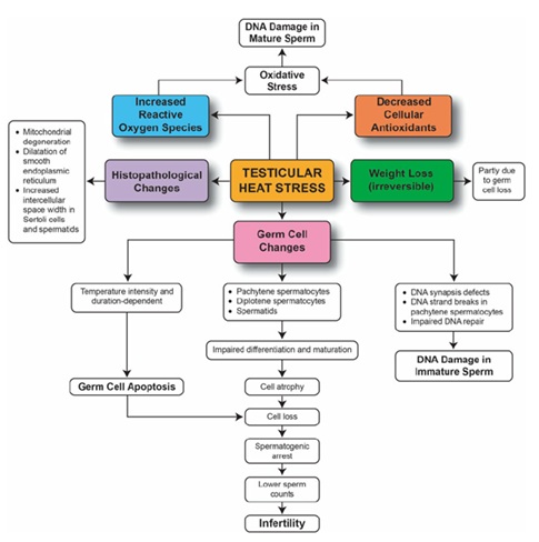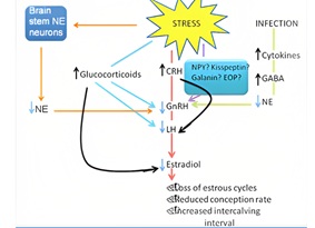 It is comprised of the hypothalamus containing neurons that secrete GnRH in pulses. Pituitary releases (LH) and (FSH), and the gonads secrete the gonadal hormones estradiol and progesterone in females or testosterone in males. Stress impacts livestock reproduction by reduced feed intake, altered endocrine status, reduction in rumination and nutrient absorption. Increased maintenance requirements resulting in a net decrease in nutrient/energy availability for reproduction [15]. Stress (heat, nutritional, pH, immunological, physiological) prevents the basic cell function by causing improper folding of proteins. Stress could impair fertility by affecting GnRH–LH pulsatility, estradiol pro?les, LH surge timing and levels, follicular recruitment and development, and ovulation. Glucocorticoids, vasopressin, ACTH, CRH, opioids have an inhibitory effect on LH secretion [16]. Glucocorticoids can inhibit gonadal steroid secretion and alter the sensitivity of target tissues to these hormones. Effect of stress on reproductive functions is also severe. Stress inhibits reproductive functions. This is probably mediated through a reduction in norepinephrine (NE) levels in the hypothalamus, an increase in corticotrophin releasing hormone (CRH), or through an increase in cytokines that increases gamma amino butyric acid (GABA) to suppress NE levels. The net result is a reduction in gonadotropin releasing hormone (GnRH), luteinizing hormone (LH), and estradiol levels that functionally translates to loss of estrous cyclicity, reduced ovulation and conception rates and increasing intercalving intervals [17]. Effect of stress on male and female reproductive system is shown in (Figures 6 & 7) respectively.