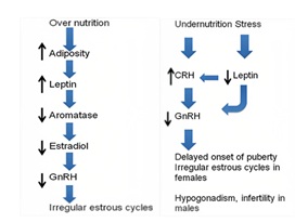 Undernutrition and malnutrition lead to an increase in CRH levels, which can lead to a decrease in the release of GnRH and LH [18-19]. Decrease in GnRH and LH release lead to a decrease in reproductive function, including a decrease in fertility and an increase in the risk of miscarriage [20]. Leptin produced primarily in adipose tissue, acts on the hypothalamus to regulate appetite and energy balance. Leptin has also been shown to play a critical role in the regulation of reproductive function. Leptin stimulates the release of GnRH, in turn stimulating the release of LH [21] and malnutrition can lead to a decrease in leptin levels, which can lead to a decrease in the release of GnRH and LH [22]. The mechanism has been discroibed in (Figure 8).