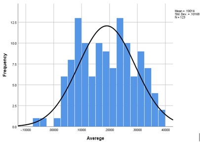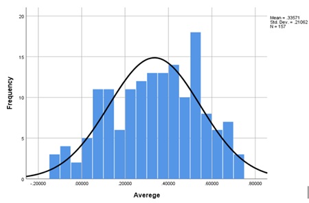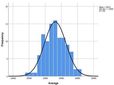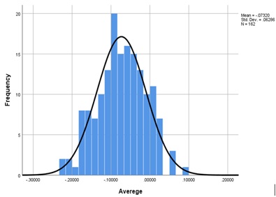 The normality test was conducted separately for the data obtained from each area. Therefore, the normality of the data for the first coordinate was assessed using the Kolmogorov-Smirnov test (Table 2) and by plotting a histogram (Figure 1). Since the calculated p-value was 0.200, which is greater than the significance level (α) of 0.05, and the histogram exhibited a bell-shaped distribution, the data were confirmed to be normally distributed. Consequently, parametric tests were employed for data analysis and examination.