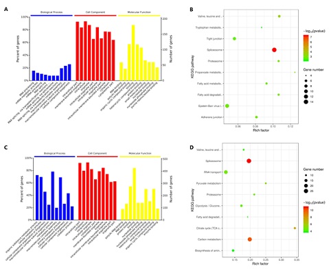 The proteomic analysis identified 7874 peptides and 1697 proteins. Among all the identified proteins, there were 81 up-regulated and 128 down-regulated differentially expressed proteins in the model group and the normal group, and there were 333 up-regulated and 194 down-regulated differentially expressed proteins in the pressure group and the normal group. After that, the function and pathway annotation of differentially expressed proteins were performed (Figure 1). In the model group and the normal group, the differentially expressed proteins were enriched in RNA processing, mRNA metabolic process, mRNA processing, RNA splicing, mRNA splicing, via spliceosome, intracellular part, membrane-bounded organelle, intracellular, organelle, intracellular organelle part, RNA binding, poly(A) RNA binding, organic cyclic compound binding, binding and heterocyclic compound binding (Figure 1A). Meanwhile, the differentially expressed proteins were enriched in those pathways, such as Spliceosome, Valine, leucine and isoleucine degradation, Proteasome, Fatty acid degradation and Adherens junction (Figure 1B).