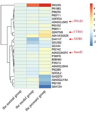 The previous research preliminarily confirmed that the Flexcell system was applied to simulate the different degrees of periodic pressure, and it could promote or inhibit chondrocyte proliferation through the regulation of integrin. The hippo signaling pathway was one of the highly conserved signal pathways in mammals. Transcription factor TAZ/YAP played an important biological function in regulating cell growth, proliferation and apoptosis. Current research has preliminarily confirmed that the hippo signaling pathway not only played a role in maintaining the internal environment stability and tumor development, but also played an important role in signal transduction of mechanical stimulation. In this study, the protein level in hippo signaling pathway in the normal group, the model group and the pressure group was shown in figure 2, implying that ITG-β1, CYR61, MOB1and Smad2 were differentially expressed proteins in the three groups.