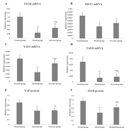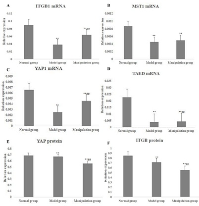 Figure 5: The mRNAs and proteins in Hippo/YAP pathway of knee joint of rats in each group. A: the ITGB1 mRNA expression in normal group, model group and manipulation group; B: the MST1 mRNA expression in normal group, model group and manipulation group; C: the YAP1 mRNA expression in normal group, model group and manipulation group; D: the TAED mRNA expression in normal group, model group and manipulation group; E: the YAP protein expression in normal group, model group and manipulation group; F: the ITGB1 protein expression in normal group, model group and manipulation group. * represented p < 0.05 compared with the normal group; ** represented p < 0.01 compared with the normal group; # represented p < 0.05 compared with the model group; ## represented p < 0.01 compared with the model group.