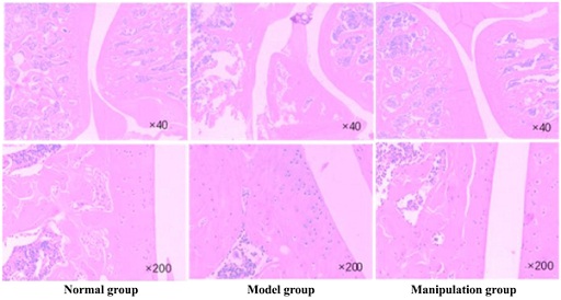 Figure 4: HE staining results of the cartilage of knee joint in the normal group, model group and manipulation group.