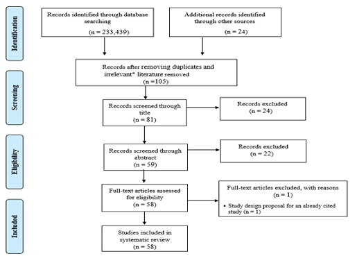 Initially, using all the key words, 233,439 articles emerged. However, following the procedures and methods provided above, the number of articles were reduced to 105. After applying the exclusion criteria discussed above and eliminating further articles or sources during the thorough review, a total of 58 articles, reports, conference papers and other gray literature (e.g., policy statements or professional association articles) were included. The bibliography contains a citation of the report, article, or document using the APA 6th Edition Style Manual.
