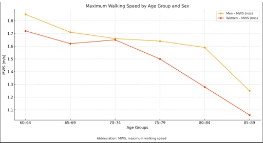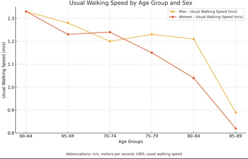 Figure 1: Usual Walking Speed by Age Group and Sex: This line graph illustrates the usual walking speed (in meters per second) across different age groups for men and women. Both sexes show a decline in walking speed with increasing age. Women show a sharper decline after age 75-79, with a notable drop in the 85-89 group. Men maintain a higher usual walking speed across all age groups.