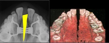 As the name implies, it is a device that acts on the palate by expanding it rapidly and in its most common form it consists of a central screw with 4 arms attached to 2 or 4 bands or to an acrylic resin splint (a bite block) [25]. It acts in a short time not only by distracting the median suture of the maxilla, but also by activating the circummaxillary sutures (scalar, frontonasal and pterygopalatine zygomatico) [26-27]. With its action it directly and indirectly involves the structures connected to the maxillary bone such as the nasal cavities, the pharynx, the pterygoid process of the sphenoid and the mandible. The characteristic of ERP is the application of a high force (up to 10 kg) on the posterior dentoalveolar processes of the maxilla to which it is anchored [28-29]. Initially the dentoalveolar processes undergo a tilting movement (tipping movement of the molars), after which the force transmitted to the maxillary sutures causes a separation of the two halves of the palate along the median palatine suture (Figure 2): the final result is a variation in the width of the jawbone. The opening of the suture is clinically manifested by the appearance of an interincisal diastema, which closes spontaneously in the 2/3 months for skeletal recurrence and traction of the transseptal fibers.