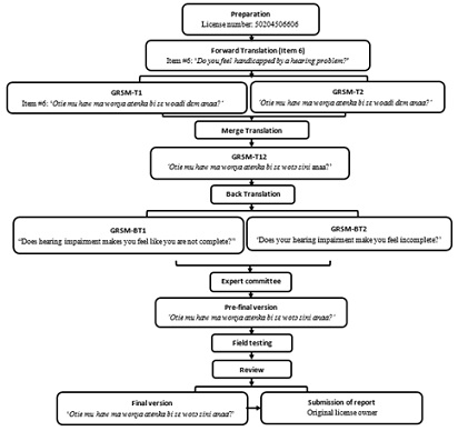 Merge Translation: Another independent and unbiased bilingual language expert, fluent in Asante-Twi and English, merged the two forward translations (GSRM-T1 and GSRM T2) into a single document. Differences between the two initial translations were discussed and resolved by consensus among the three translators. The merged translation was called the GSRM-T12.