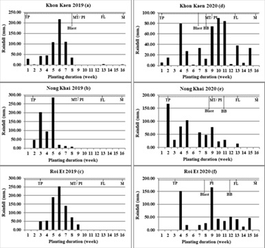 Disease Resistance of Kdml105 Introgression Lines (Ils) Under Field Condition: Evaluation the disease resistance of ILs. The ILs were evaluated in six different environments that have been reported for the stresses related to gene introgressed. In this study, two stresses, blast and bacterial blight (BB) diseases were found. Interestingly, disease infection was mostly observed in 2020 which the rain distributed widely (Figure 1). In contrast, short rainfall distribution was observed in 2019, almost finished in September (Figure 1). Widely rainfall distribution was previously reported to be related to high relative humidity [32], which is the favorable condition for infection, growth and distribution of blast and BB [33] during vegetative to reproductive phases [11]. Moreover, Khan [33] have demonstrated that the rainfall positively correlated with severity of blast disease in five rice varieties. In addition, field management especially plant spacing also affected blast disease severity. This studied was low blast disease severity cause of conducted planting methods for hill and row spacing which lower leaf blast severity than broadcasted direct seeding [34]. Likewise, BB is waterborne disease distributed along with water [35] and damaged in the watering condition. Contrary, the short rainfall distribution likely leads to minimal disease severity.