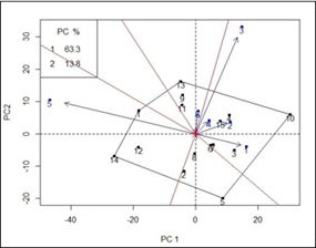 Mean comparison of effective grain yield for individual environment caused by GxE interaction. The environments with higher mean yield were Khon Kaen 2019 (4,391 kg./ha) followed by Nong Khai 2020 (3,383 kg./ha), Nong Khai 2019 (3,328 kg./ha), Khon Kaen 2020 (3,282 kg./ha), Roi Et 2020 (3,015 kg./ha) and Roi Et 2019 (2,976 kg./ha) respectivly. The results showed that there were no significant differences in five environments including Khon Kaen 2019, Nong Khai 2019, Roi Et 2019, Khon Kaen 2020, and Roi Et 2020 but the other environment Nong Khai 2020 was significant at 95% confidence level (Table 3). Where focus on Nong Khai 2020 conditions, presenting as top three genotypes were higher-yielding than the standard check KDML105 including 1 (RGD00002-MS83-3-B4-49), 12 (RGDU03028-MS109-MS9-MS4-36-B-B), and 14 (RGDURSC-6-14G08). While other genotypes were not significant compared to KDML105 (Table 3). While, genotype 10 (RGDU03009-5-46-1-B) presented low yield at NK 2020 but the other five environments showed high yields. Other genotypes without above lines mostly not extremely yield value changed among locations.