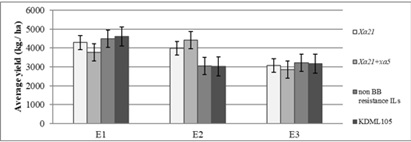 Yield Performance of Rice BB-Resistant Xa21 And Xa5 Genes Introgression Lines (Ils): In the present study, the different yield performance of four rice genotype groups, divided based on BB-resistant gene contained, across three environment groups (E1, E2 and E3) were found (Figure 4). At minimal BB infection environments, E1 and E3 were high- and low-yielding environments, respectively. Among the genotype groups evaluated in these two environments, KDML105 and non BB resistant ILs showing high mean yielding genotype groups, which were higher than Xa21 ILs and Xa21+xa5 ILs. However, the yields were not statistically different among groups (Figure 4). Whereas, at severe BB infection environment E2, a highly yield significant difference for genotype groups were archived, in which the yield of Xa21+xa5 ILs and Xa21 ILs were higher than KDML105 and non BB-resistant ILs (Figure 4, Table 3), [29]. The result resembling Ansari [11] were studied for yield loss asessesment of rice due to bacterial blight compared among resistance and susceptible variety at different growth stages with highest yield loss 47.4 % appeared in susceptible variety but resistance variety presented maximum yield loss 16.2 %. The result also reported by Reddy [30] BB disease infection could reduced the rice yield with high severity when early inoculation caused by less panicle fertilization which were affected by plant leaves photosynthesis reduced by BB severity index on source leaf [31]. Under severe BB occurent area as Nong Khai, rice variety containing BB resistance genes Xa21+xa5 or at least Xa21 should be practiced. In ordinary condition such as Khon Kaen and Roi Et environments those without severe disease occurrence should use the lines showing high yield, yield stability and greater agronomic traits when compare with KDML105.
